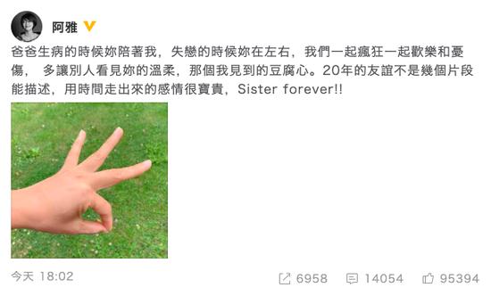 阿雅:“20年的友谊不是几个片段能描述,用时间走出来的感情很宝贵”,力挺大S